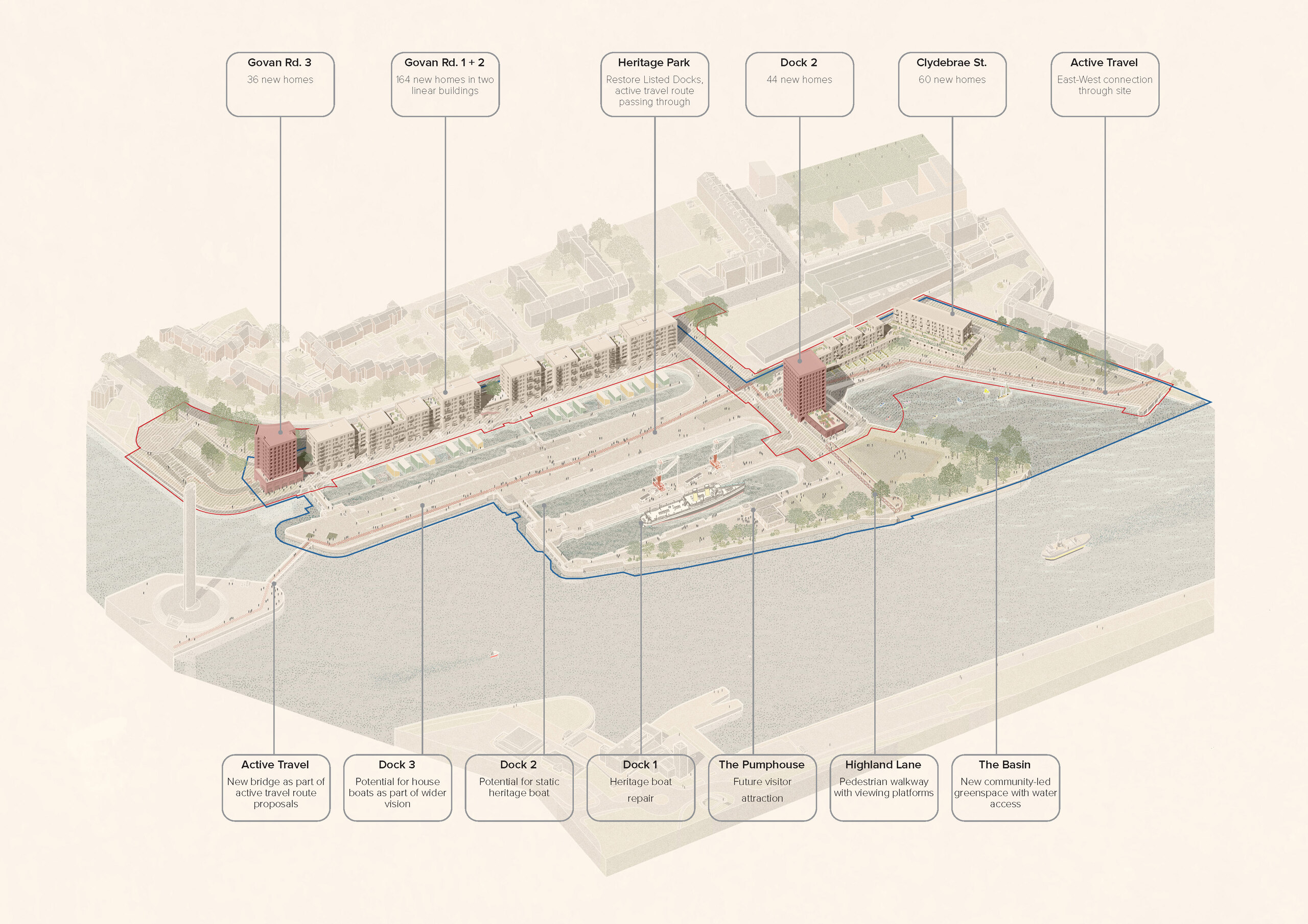 The Govan community now looks forward to the prospect of living alongside a public Maritime Heritage Park, with Dry Dock 1, restored and used for historic ship repair, an urban wetlands zone around the basins, and visitor facilities embedded in the remaining Grade A listed Pump House. The new vision for the site also sees 304 new homes arranged along the southern perimeter, leaving the bulk of the nine hectares free for public recreation and heritage purposes.