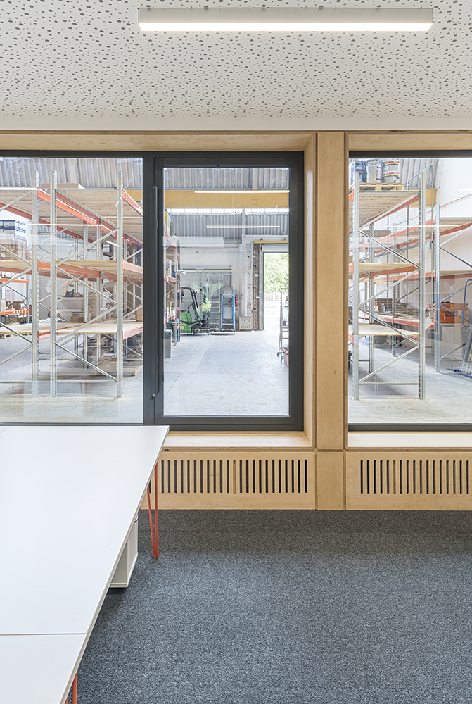 The existing unit, number 37, sits within a terrace of 2 storey cellular accommodation with large, top lit warehouses to the rear. The units are generally draughty and poorly insulated, with small windows at ground floor level which limit natural light and fresh air. We extended into the warehouse space, increasing floor area for office use, within a well-insulated timber box. Large shop front windows look out over the warehouse itself, grabbing more of the north light from the warehouse’s tall clerestory windows. Plywood lining and shelving adds both warmth to the office and a utilitarian aesthetic to the warehouse fronting façade.