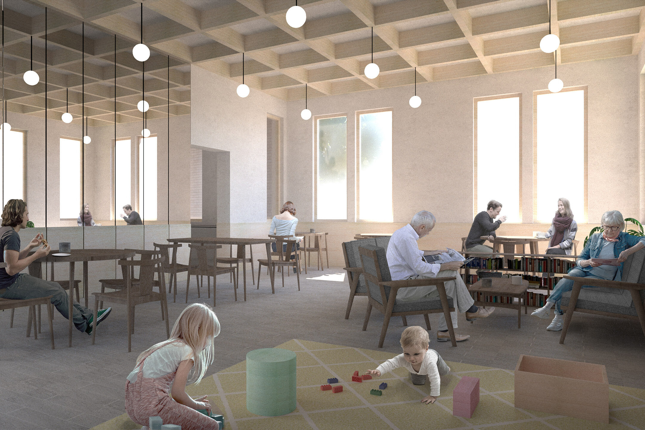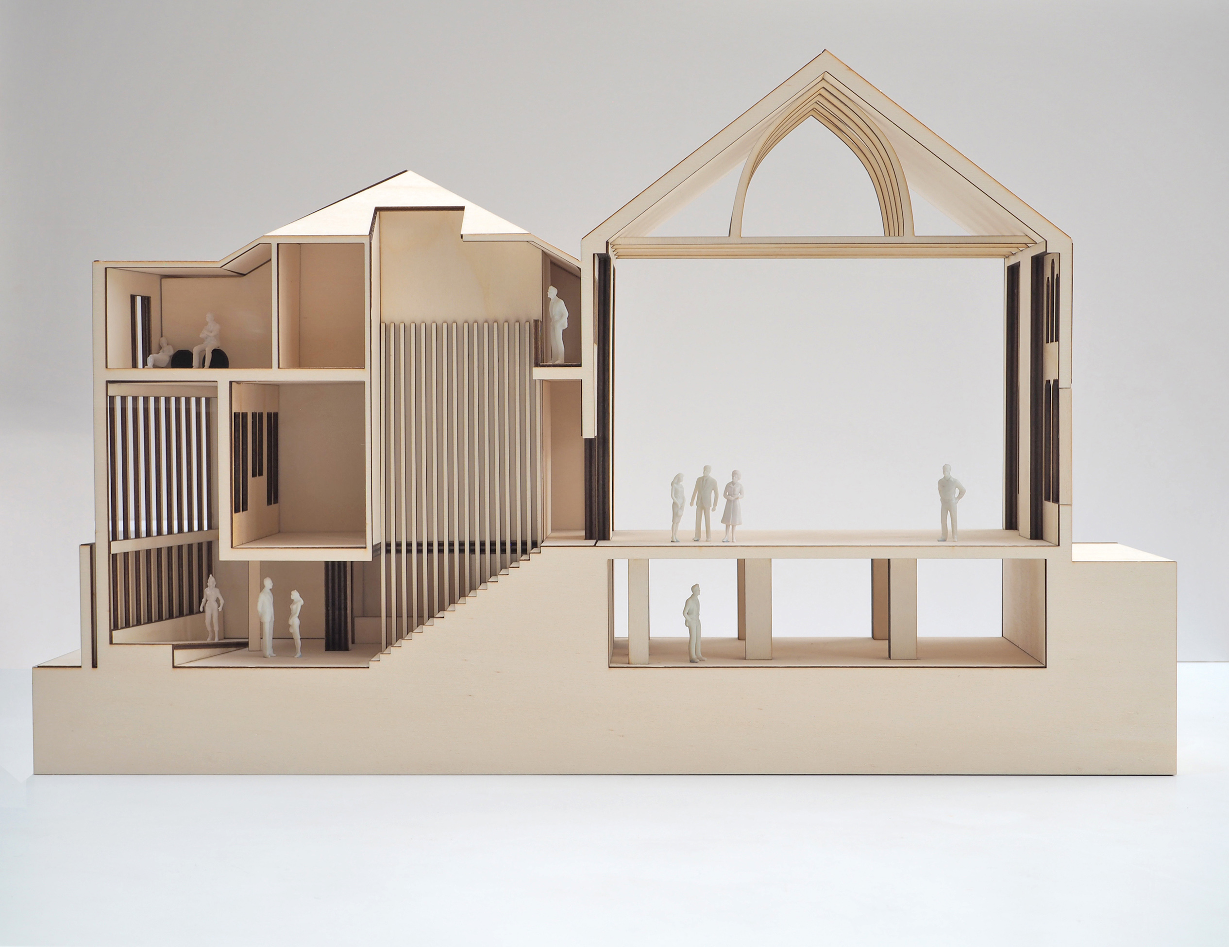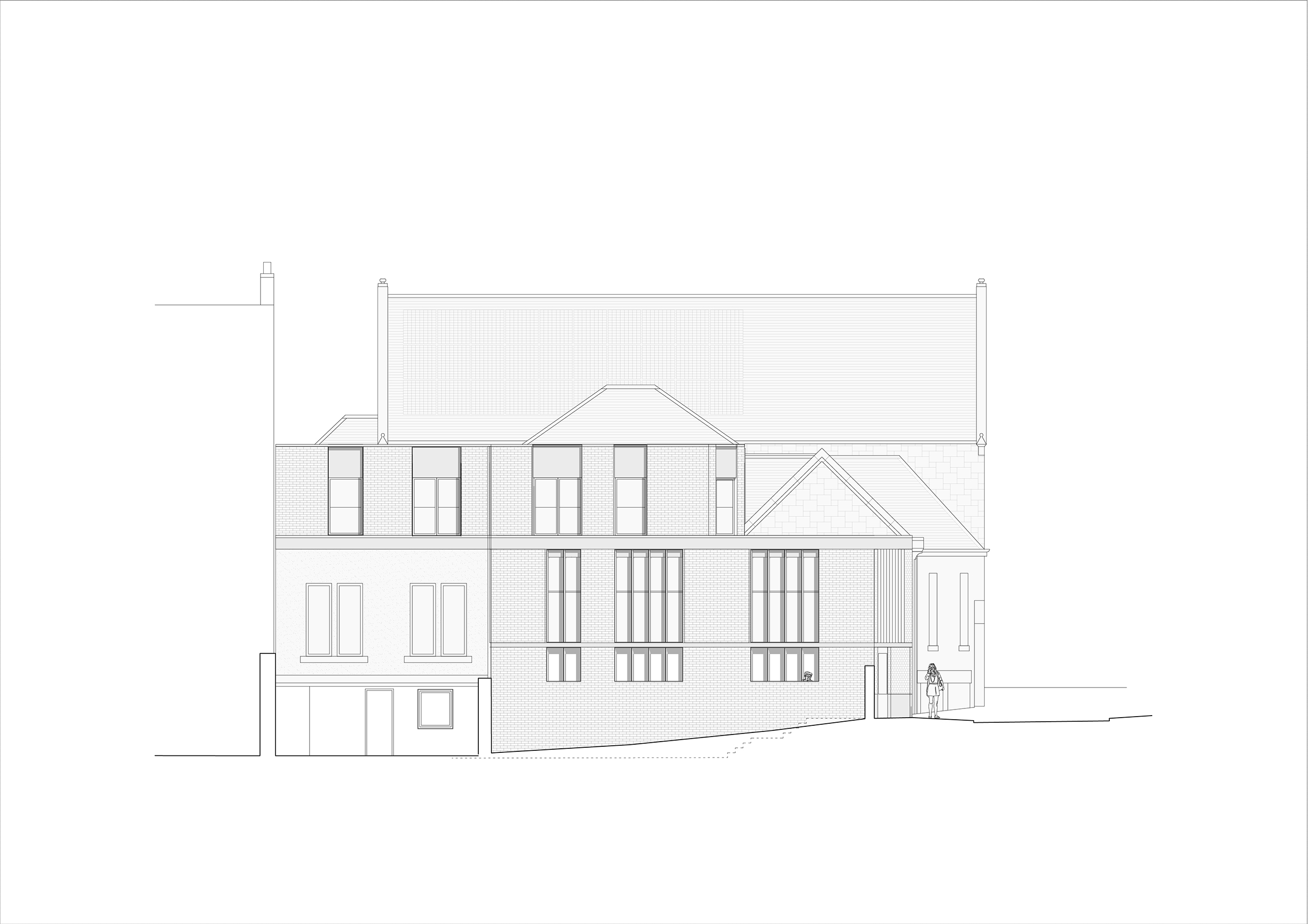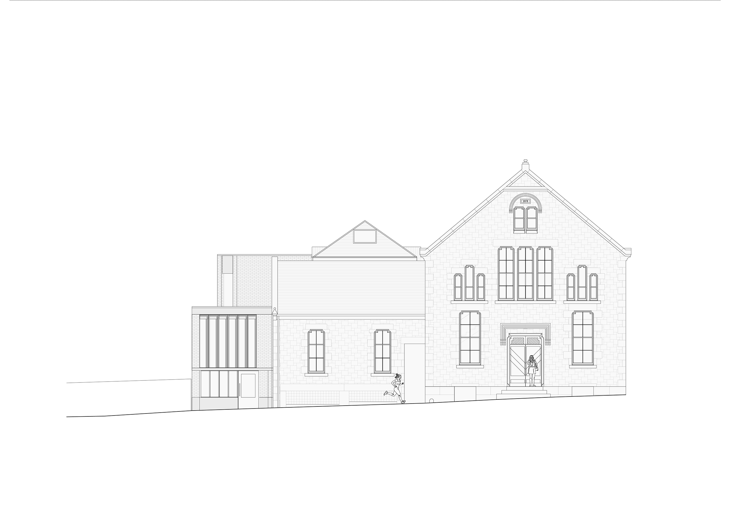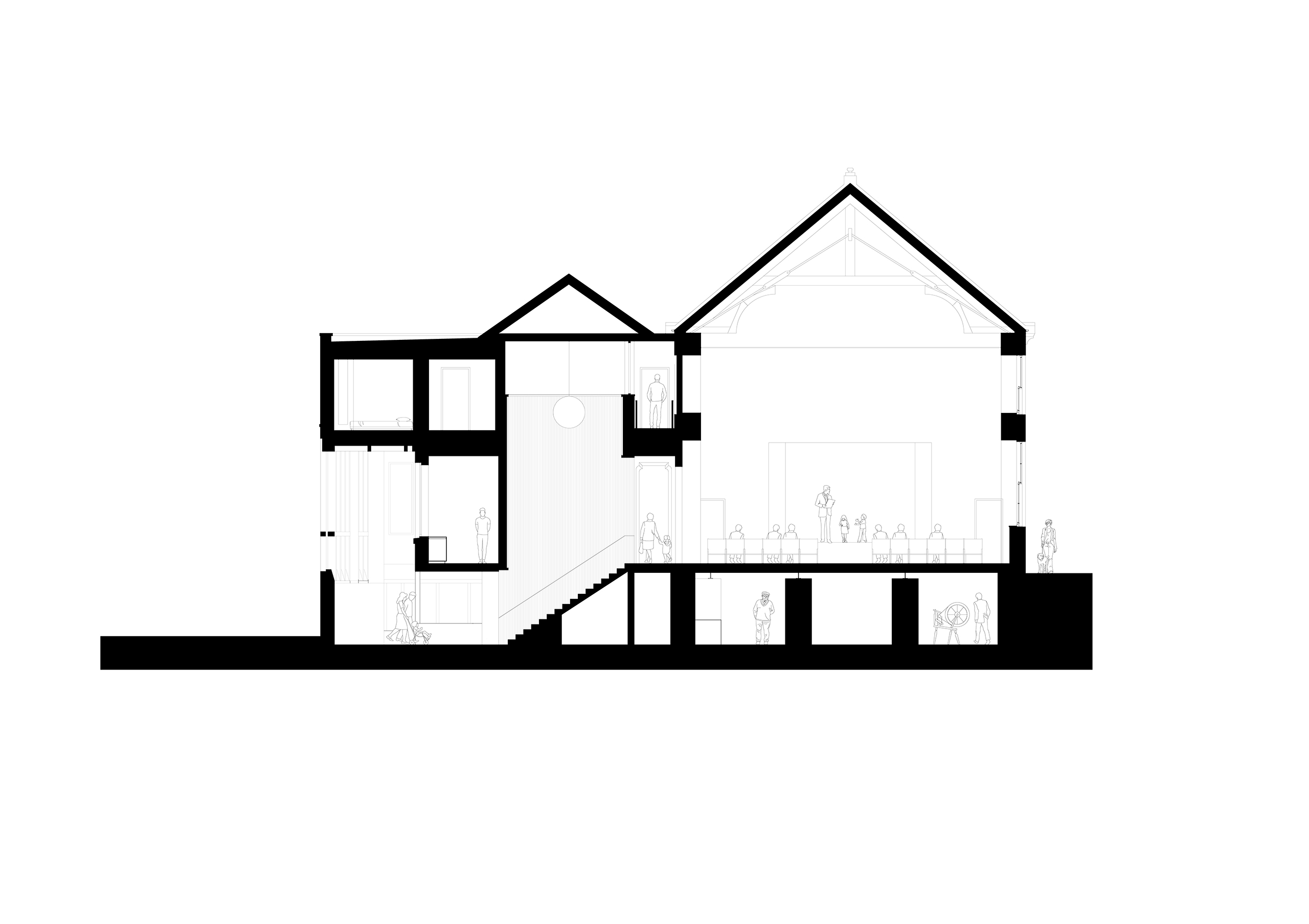 Built in 1878 and vacant since 2012, the building had been the town’s civic centre for many years and had served several functions, including use as a cinema until the end of the 20th century however, the building closed due to limited maintenance and care, following years of attempts to sustain it. Through careful refurbishment and considered extension, this community-led project aims to bring the building back into active community use, while also providing new economic and social benefits to the local area. The existing town hall is typical of the vernacular, built from glaciated red sandstone with a slate roof. The materials proposed for the new east elevation (light grey brick, concrete, timber and metal) are all robust and complementary of the existing palette. They provide a contrast to avoid pastiche, ultimately seeking to unify the building without pretending it was always that way. The scheme aims to create rational, hard-working spaces for a variety of uses, while also allowing for intuitive movement around the building, with carefully crafted architectural moments.