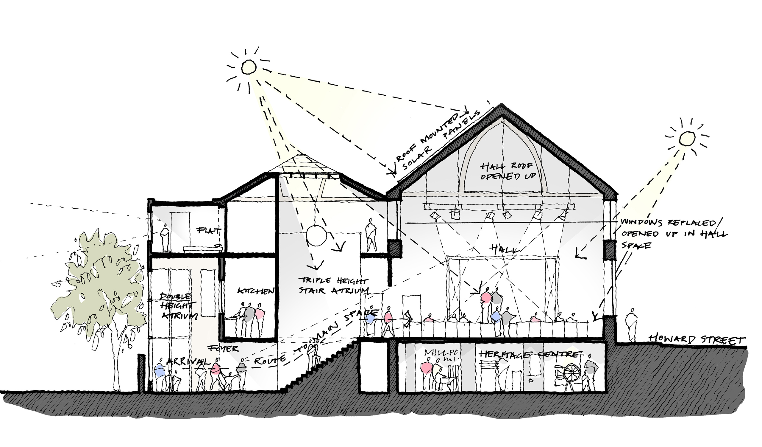 The new multipurpose hub will incorporate a performance hall with improved facilities; a new basement level heritage and conservation centre and ground floor community hub; additional high-quality, accessible toilets; a sheltered community garden; and a spacious entrance foyer – all designed to be flexible, adapting to varied activities. Three new holiday-let apartments are proposed for the second floor.
