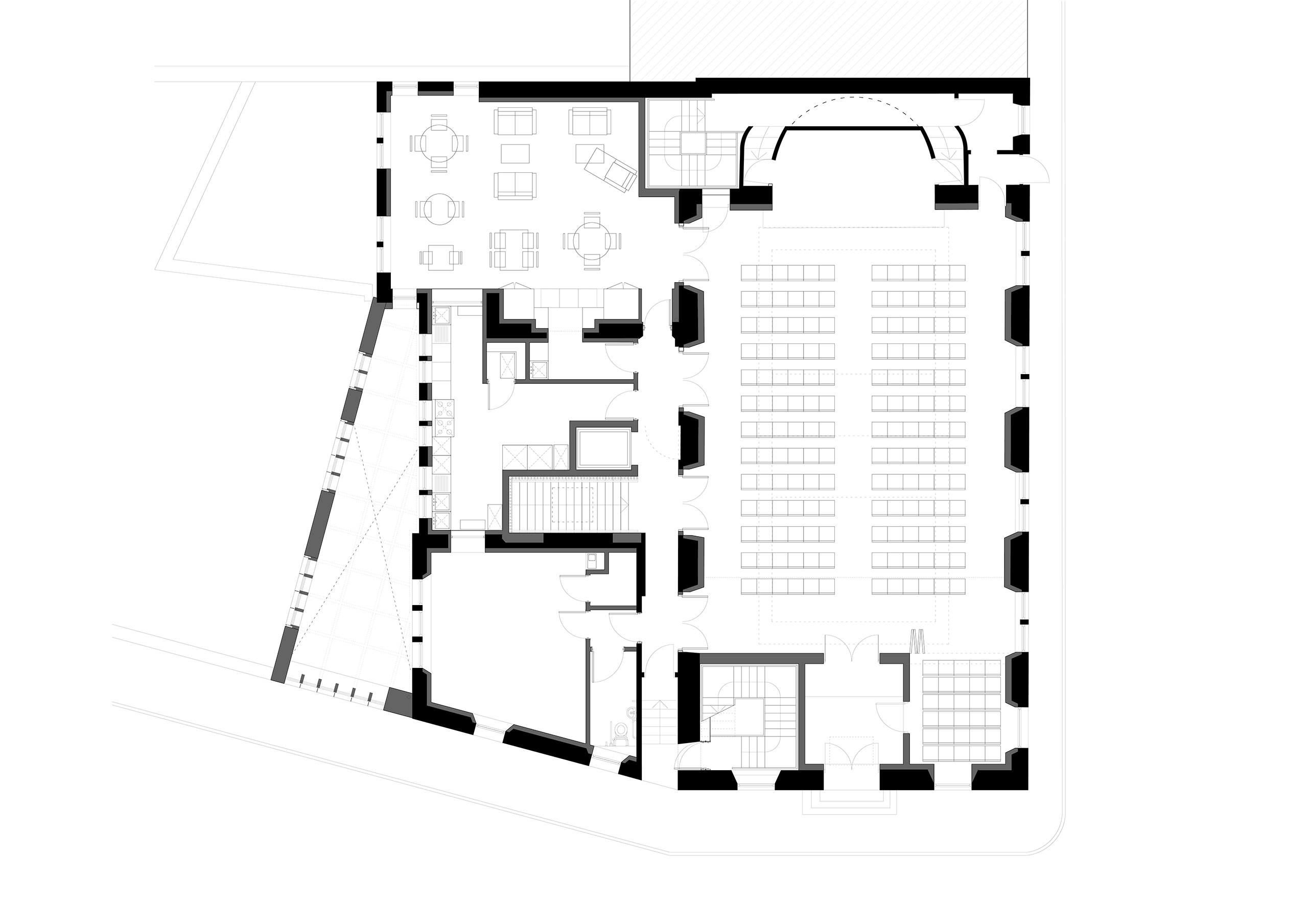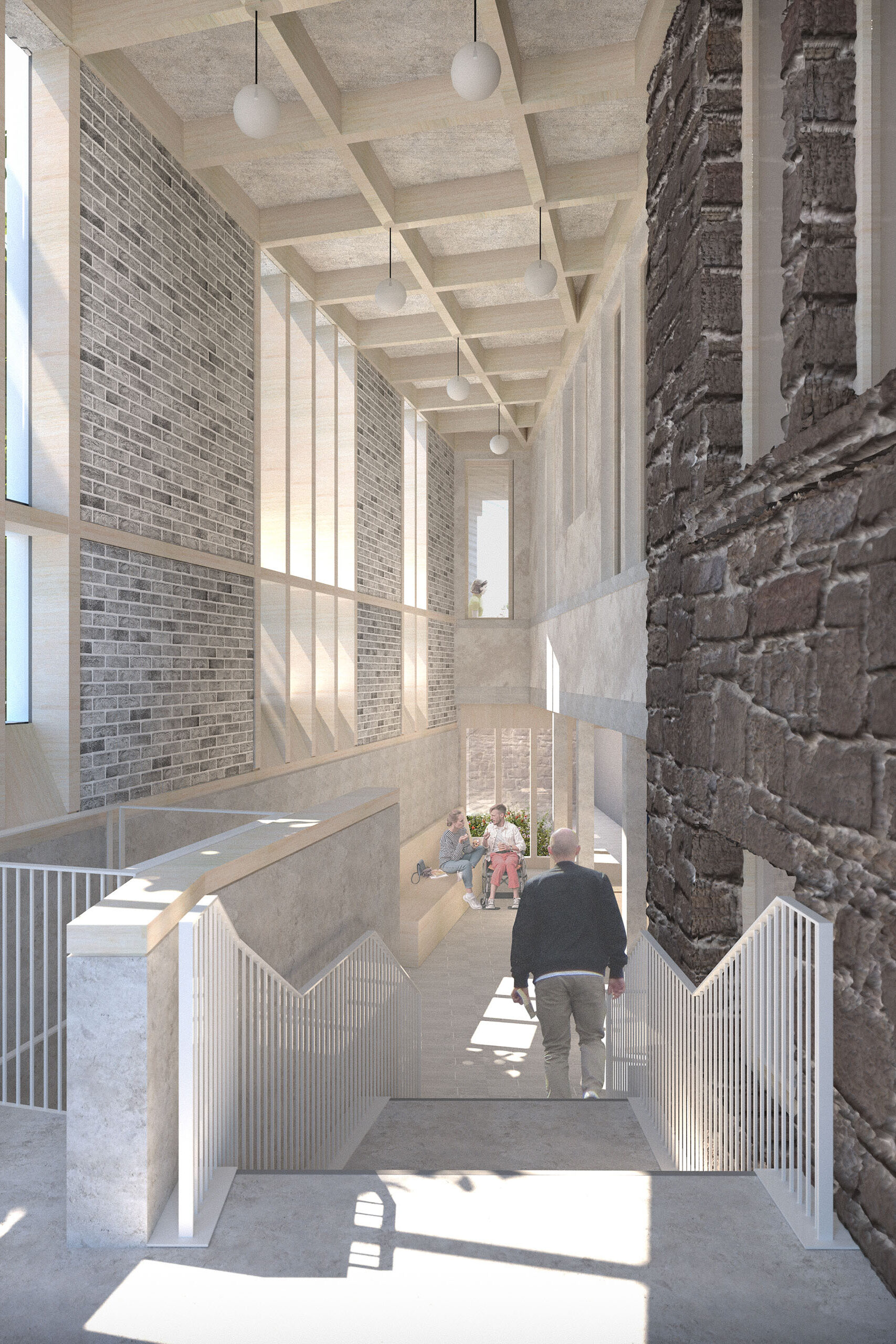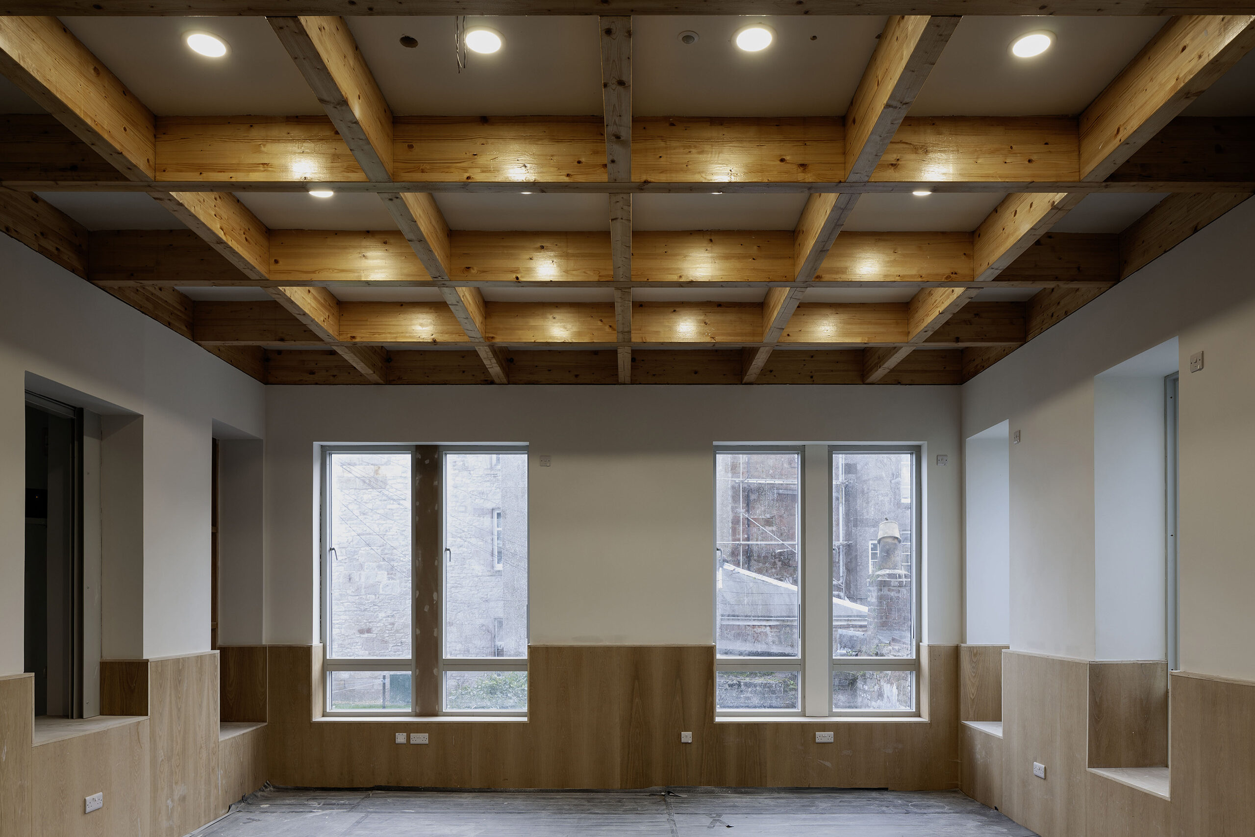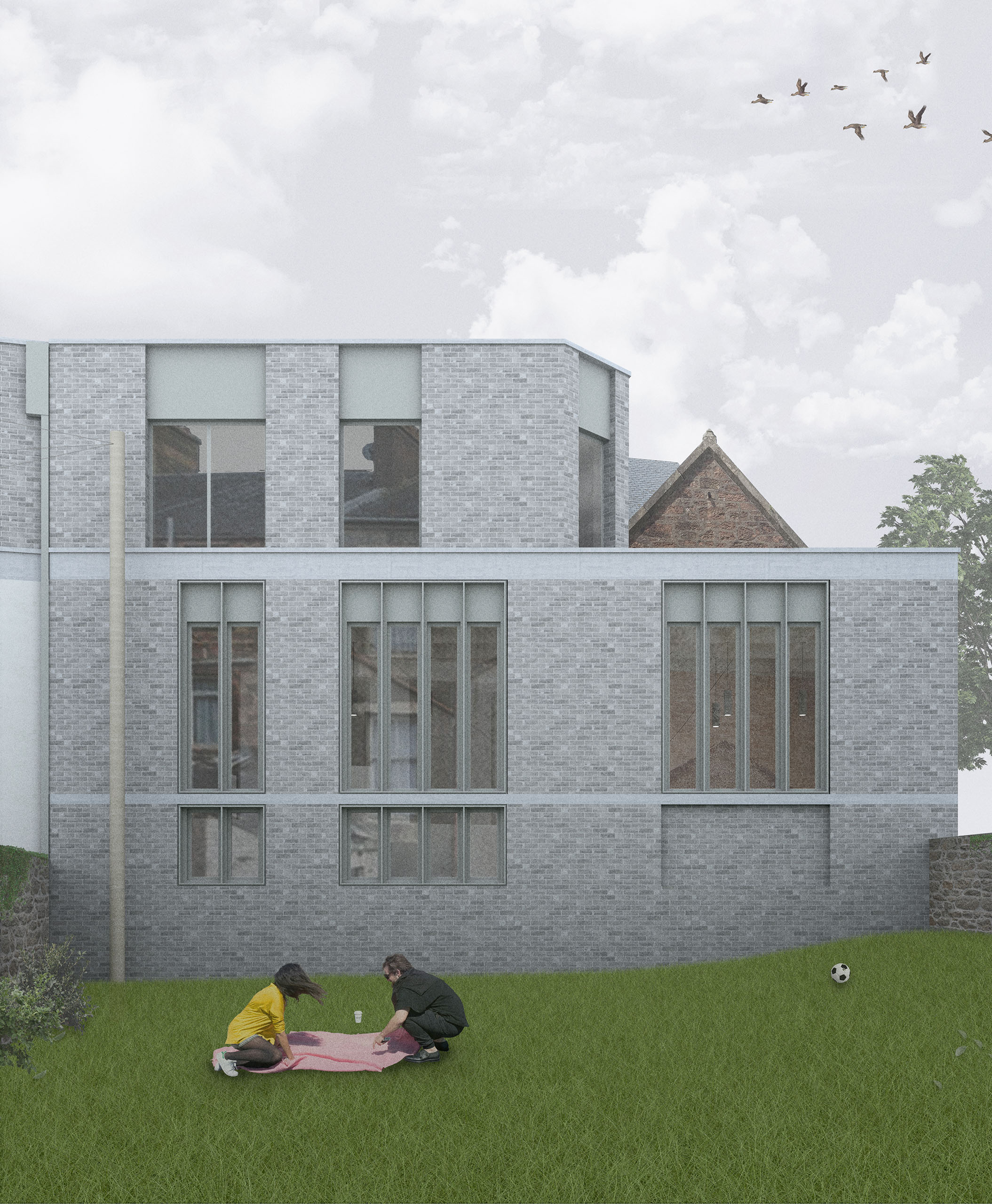 The refurbishment takes a sensitive approach, enhancing the building’s existing character through careful alterations and additions. A fabric-first strategy creates a high-performing envelope to reduce operational energy and carbon emissions, supported by roof-mounted photovoltaic panels. The neglected structure will be repaired with attention to original stonework details. A new extension introduces direct street access to the lower ground floor, which will accommodate a heritage centre, men’s shed, and green room. The main hall will be restored, with its existing access retained. Additional secondary spaces will support community uses such as meetings, art groups, and rehearsals. The first and second floors now contain three self-contained flats, providing income to sustain the building’s civic and community functions.