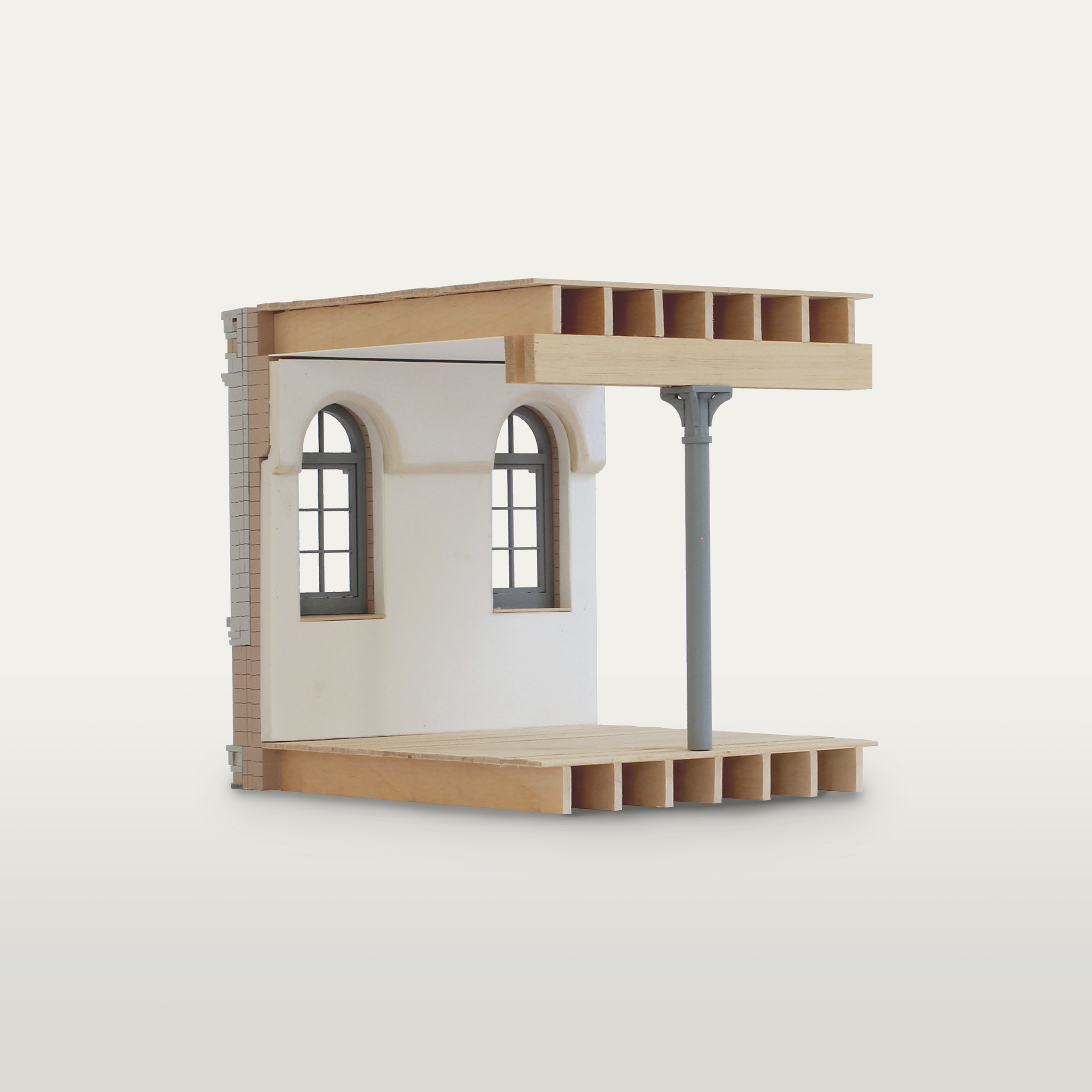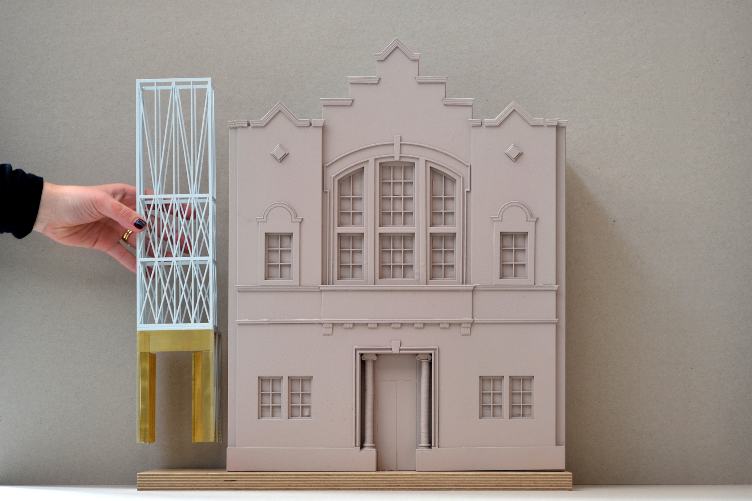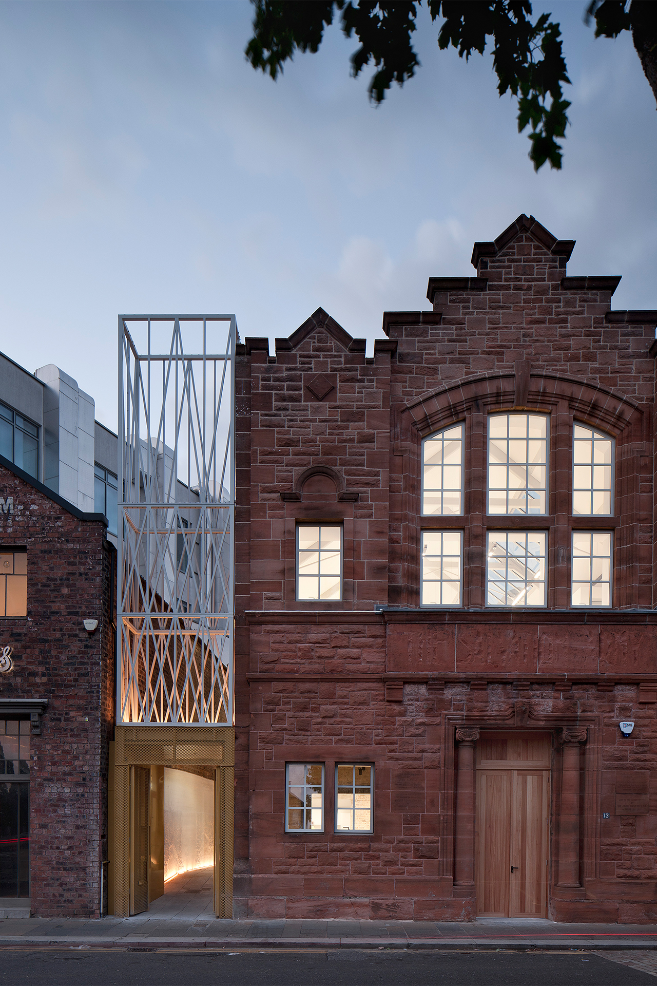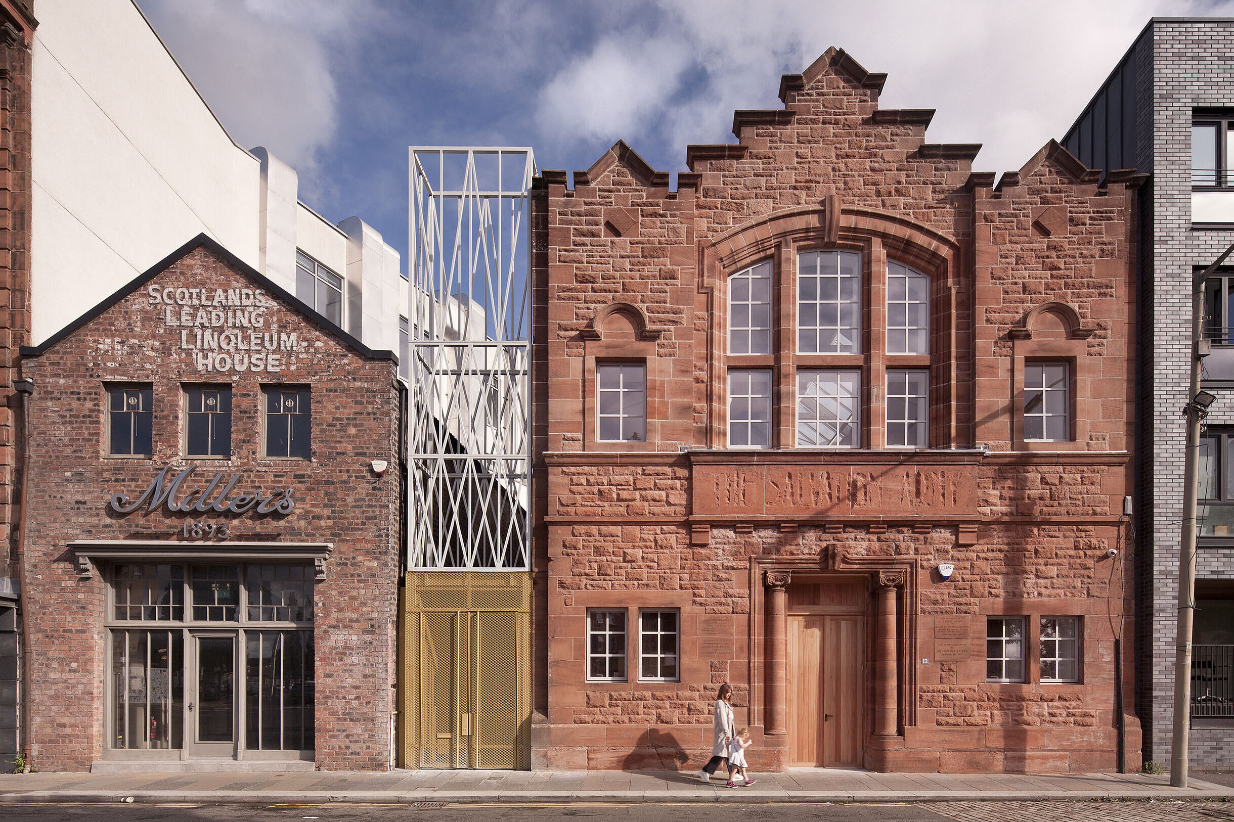 Olympia House sits within the Bridgeton Cross Conservation Area in East Glasgow and was built in 1927 as a Salvation Army Citadel. In 2023 we completed extensive ‘defurb’ works to transform the building into office space; retaining and repairing historical elements as well as significantly improving the building’s energy efficiencies and providing accessible entry. Central to the challenge of re-furbishing the building was providing access for all; our design response was to create a new ramped entrance to the side of the building, with this design move marked by a large sculptural metal tower. This Beacon confidently yet respectfully marks the new accessible entrance and makes reference to the Bridgeton Umbrella and Glasgow’s rich history of ornate metalwork.
