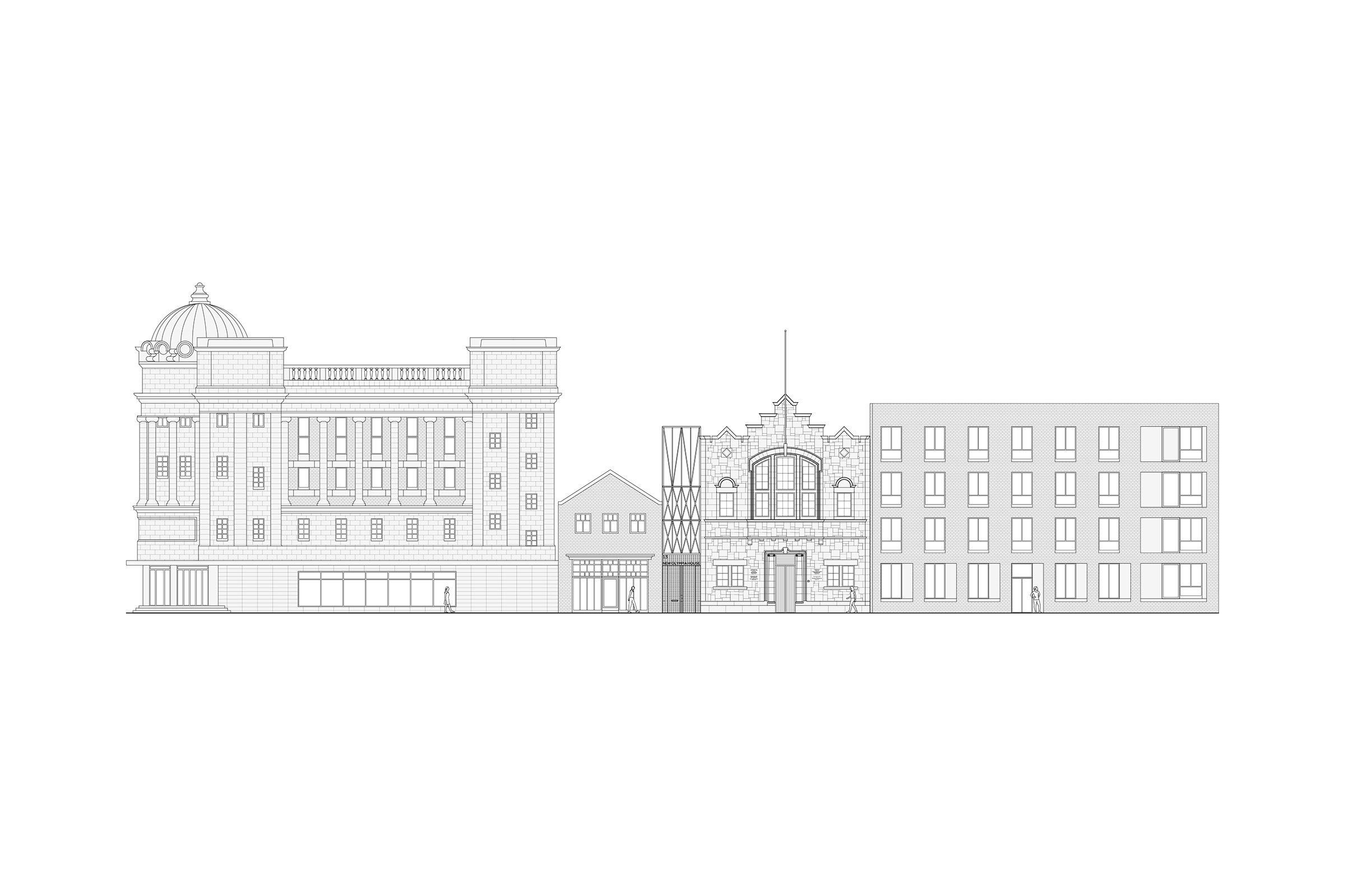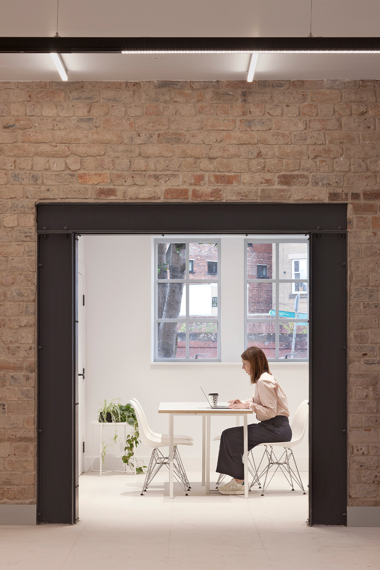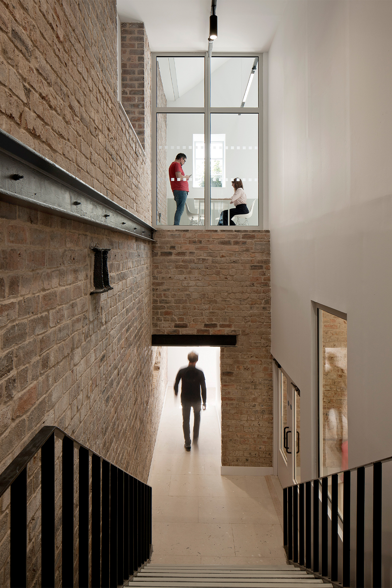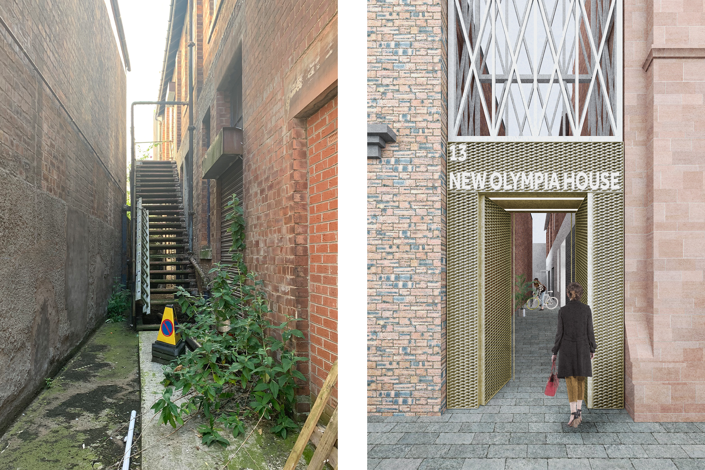 The existing Olympia House had a highly unique and well-detailed façade which indicated the likely presence of original heritage details internally. As such we wanted to approach the project with a sensitivity to its historical features and employed a ‘defurb’ strategy, stripping back and celebrating these details. The Beacon marks the new public entrance, which is now fully accessible and completes the street elevation, celebrating the area’s history of ornate metalwork as found on the Bridgeton Umbrella.