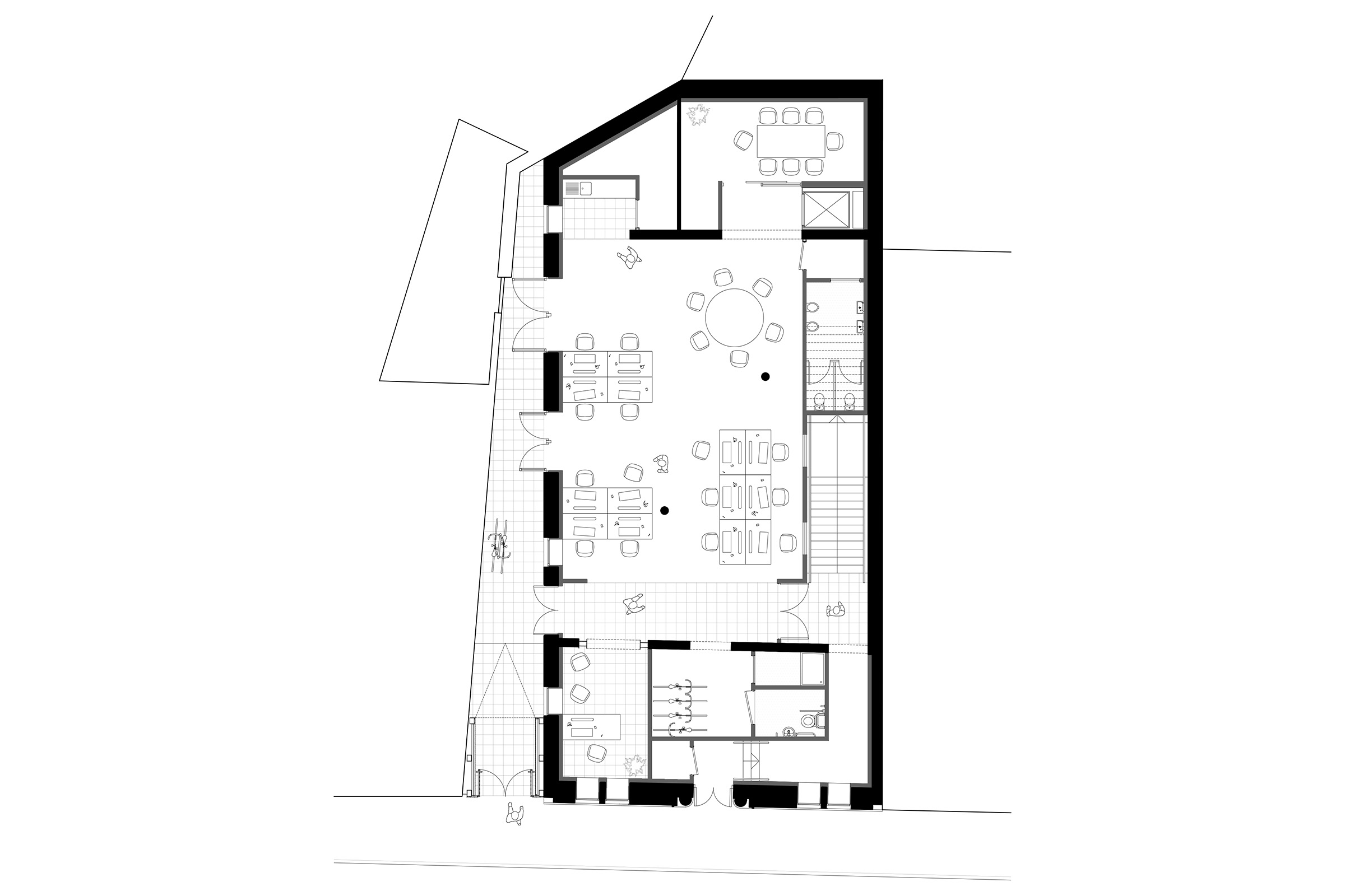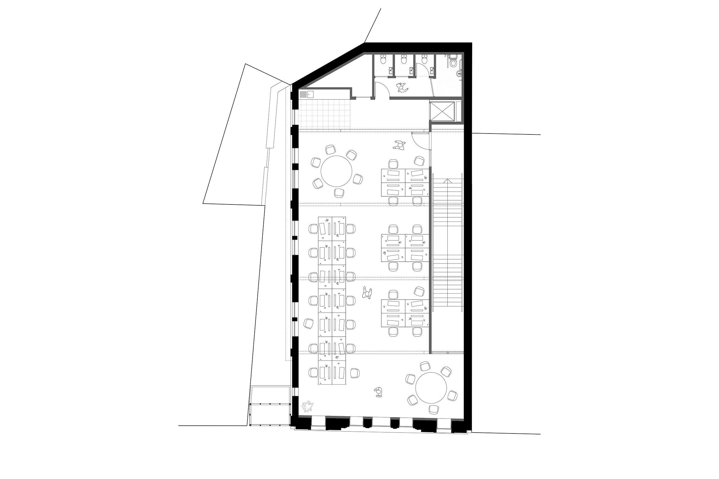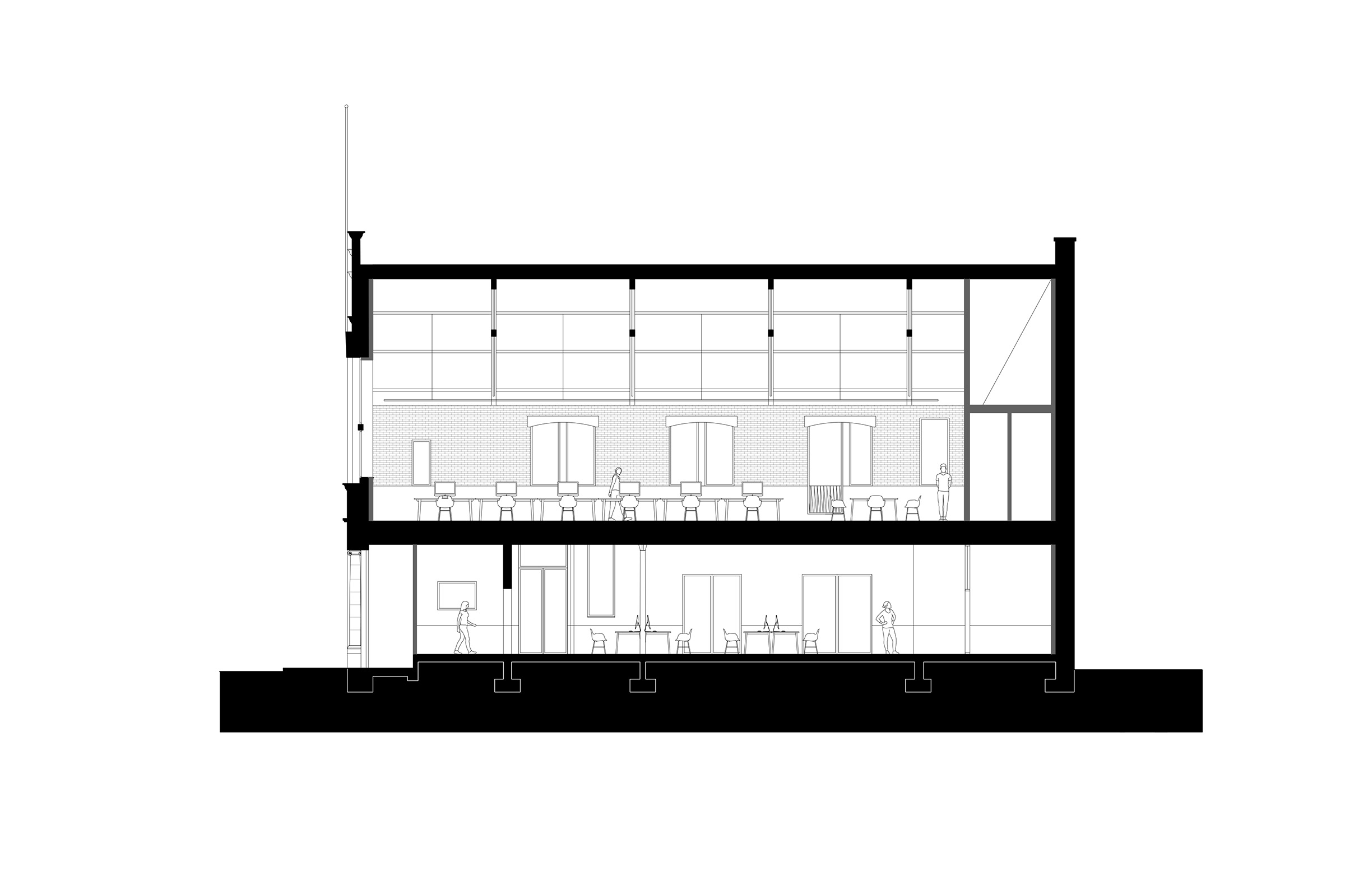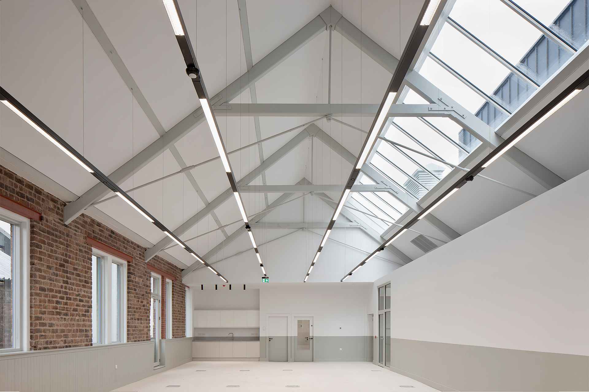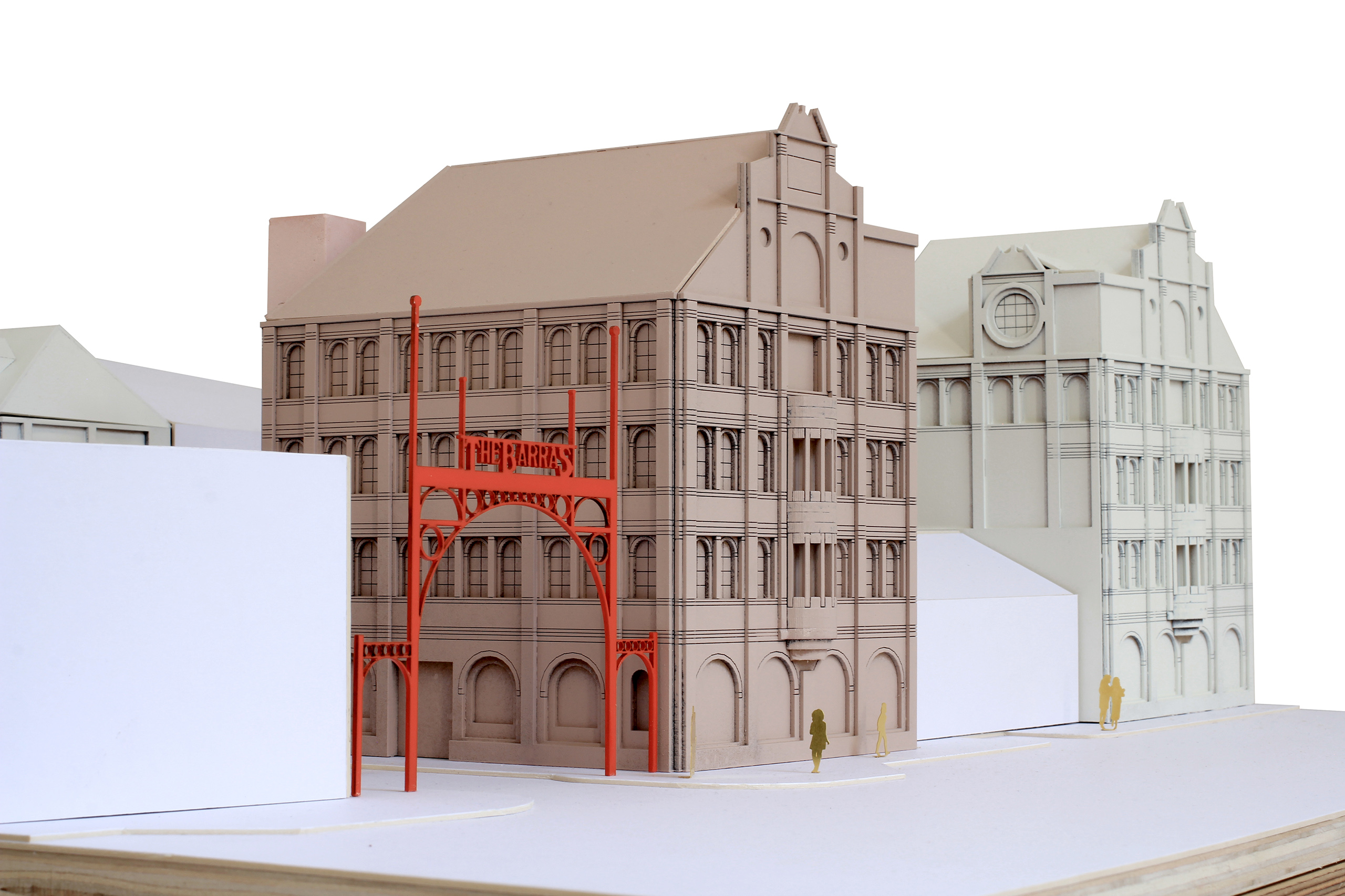 The existing Olympia House had a highly unique and well-detailed façade which indicated the likely presence of original heritage details internally. As such we wanted to approach the project with a sensitivity to its historical features and employed a ‘defurb’ strategy, stripping back and celebrating these details. The Beacon marks the new public entrance, which is now fully accessible and completes the street elevation, celebrating the area’s history of ornate metalwork as found on the Bridgeton Umbrella.