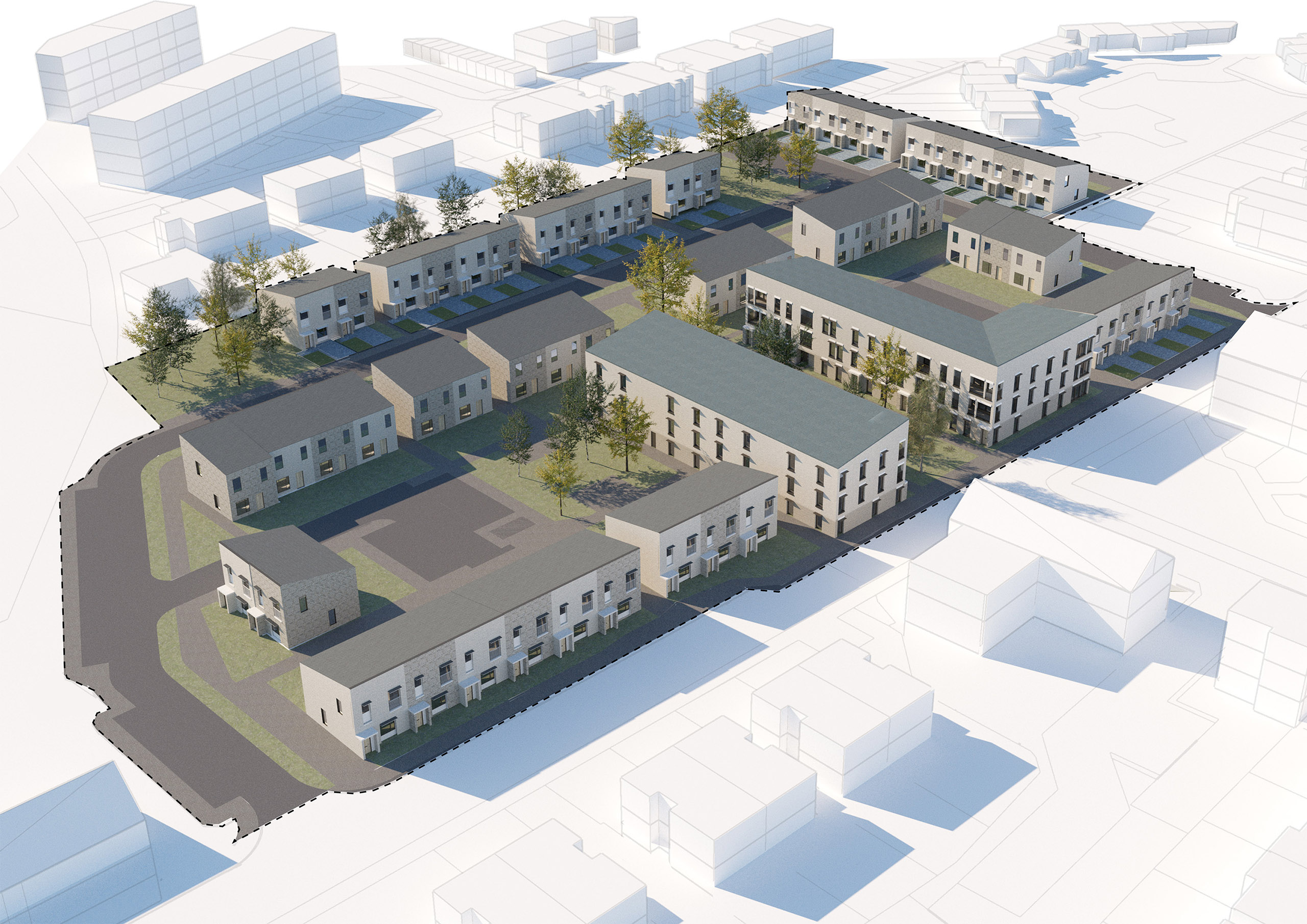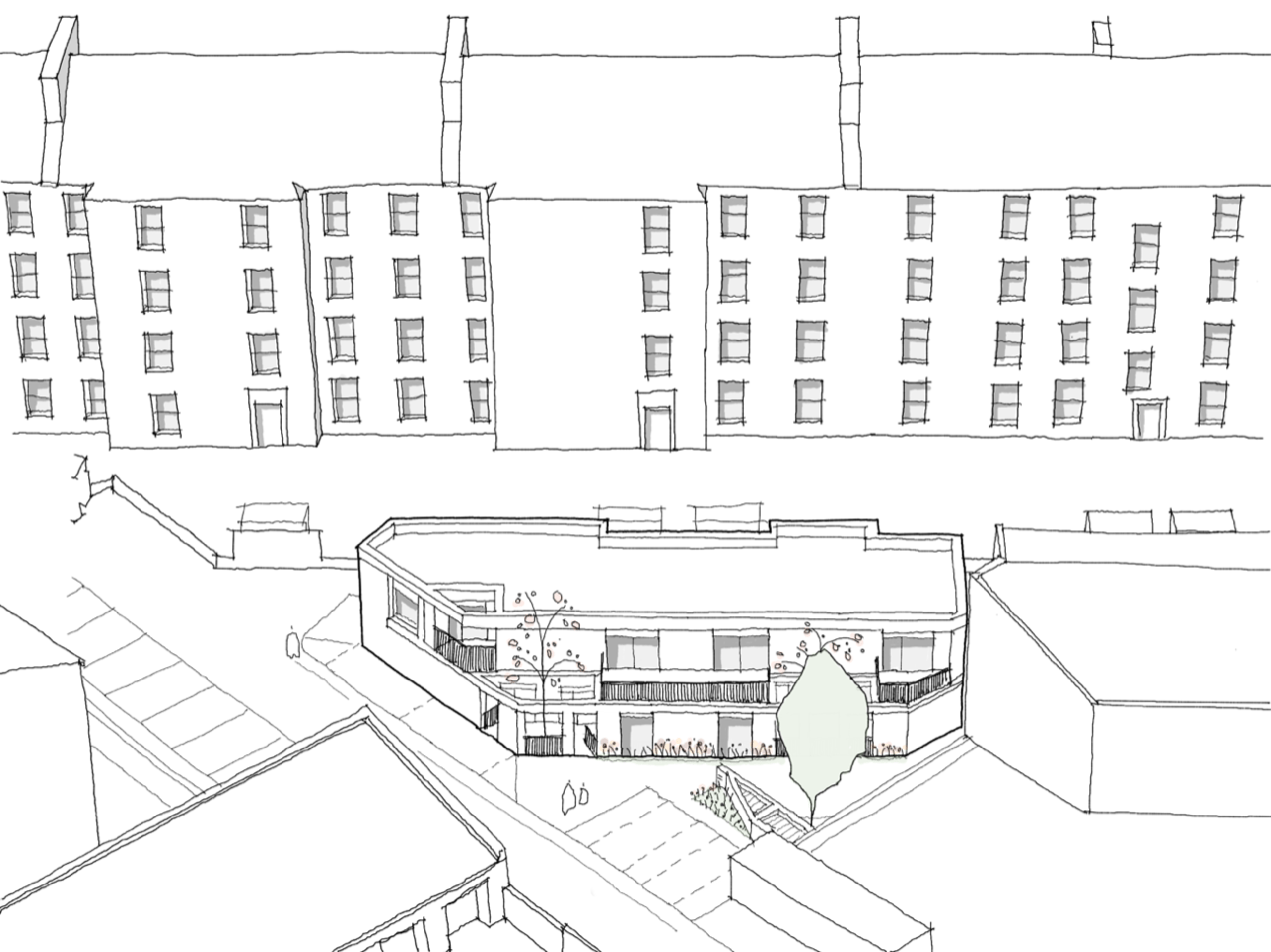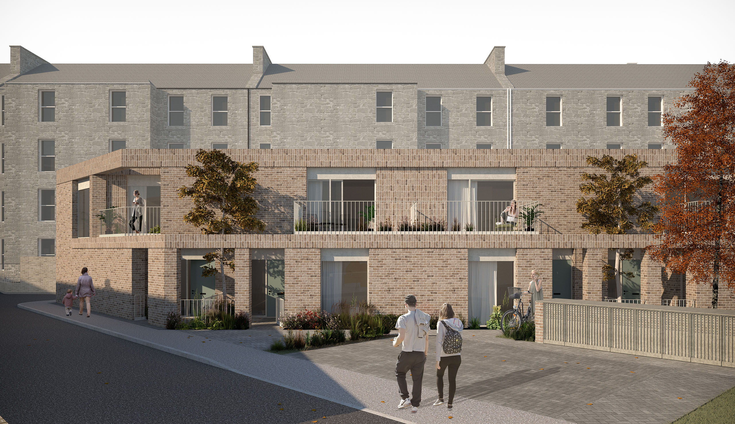Overnewton Place is a contemporary residential development comprising four two-bedroom mews houses, located in the vibrant Kelvinhaugh area of Glasgow’s West End. Designed for Mitre Properties, the project transforms a long-vacant brownfield site into high-quality, sustainable homes that respond sensitively to their urban context. Positioned just a mile west of Glasgow city centre and adjacent to key landmarks such as Kelvingrove Park and Glasgow University, the site benefits from excellent connectivity and proximity to the emerging Yorkhill and Kelvingrove Cycling Village. The development incorporates sustainable transport features including secure bike storage, wash-down areas, and a communal repair station. Each home is dual aspect and arranged around a shared south-facing garden with private entrance courtyards and upper-level terraces. A simple but refined palette of materials—primarily clay brick and architectural metalwork—reflects the area's historical industrial character and complements the adjacent tenement and student housing blocks.