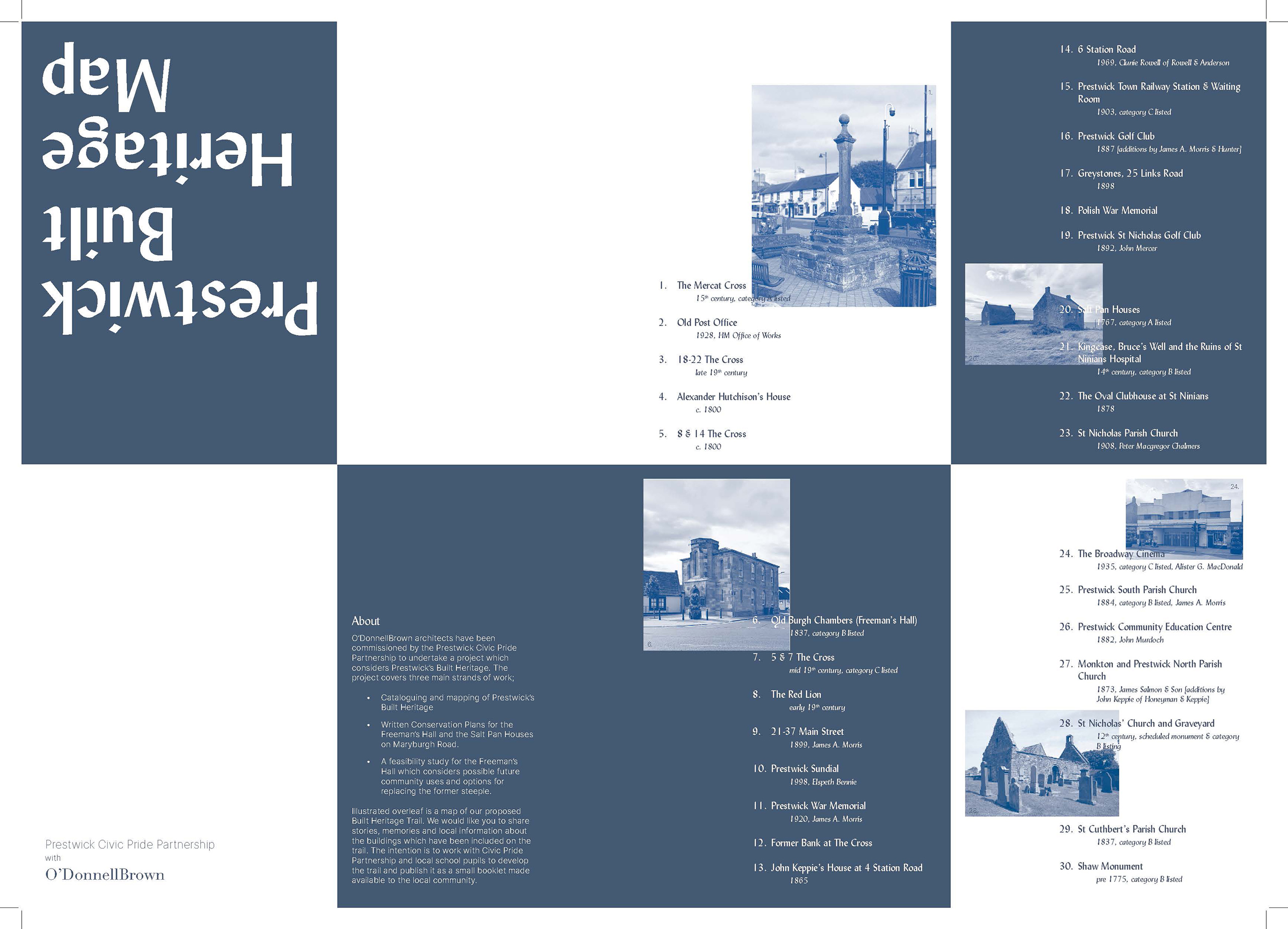 The Prestwick Built Heritage project is a community led initiative to raise awareness of important but often overlooked heritage buildings within the town of Prestwick in South Ayrshire. The project was delivered for the Prestwick Civic Pride Partnership in June 2023 and in collaboration with Advanced Accredited Conservation Architect Fiona Sinclair. The first stage of the project was to document and record the built heritage of the town through a mapping exercise and collating a visual record of each building. The information gathered during this process was then illustrated and presented in a small map which was distributed throughout the town and at a Doors Open Day event organised and arranged by O’DonnellBrown.