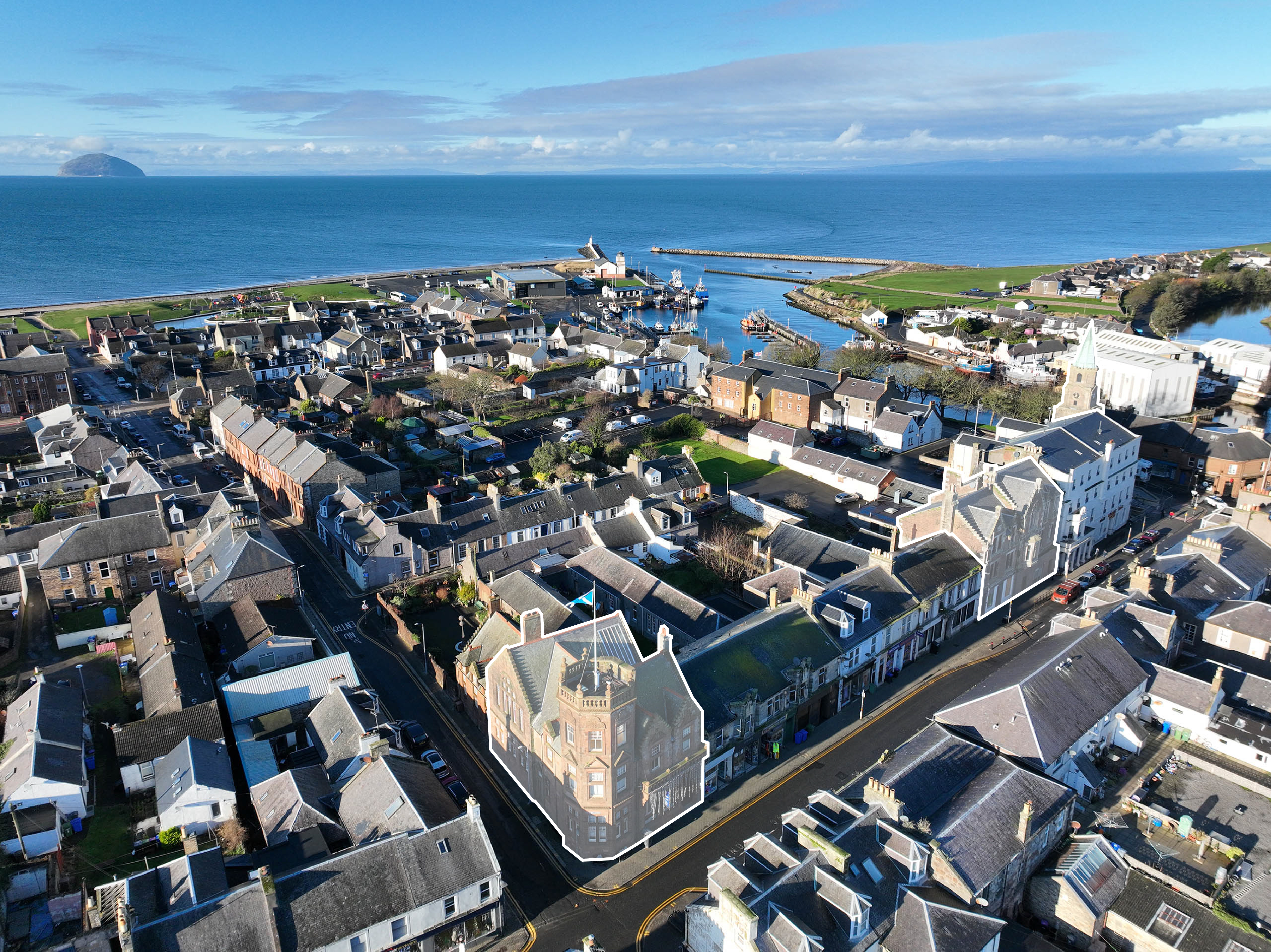 Aerial view of Girvan highlighting Stumpy Tower, McKechnie Institute & Museum and 14-18 Dalrymple Street buildings.